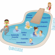 Going along with our pool analogy, wading in the shallow end would represent quantitative methods. These, like the shallow end of the pool, are more controlled and surface-deep, meaning they can encompass a larger population. Quantitative data are numbers-based and utilize standardized methodology. Some examples of quantitative data often used in evaluations include close-ended survey responses, test scores and various types of secondary data. These data are used to answer questions about what is happening and to what extent. These data are often analyzed with powerful statistical tests for generalization of larger populations. To go beyond the surface and answer questions about how and why things are happening, we look to qualitative methods.