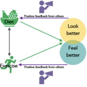 Logic models and theories of change also differ in how they progress from one step to the next. Logic models are linear, progressing step by step—typically from inputs to activities to outcomes—and an effect never precedes a cause. In a theory of change, however, components are not always linear and effects can, and often do, later influence causes (for example, as shown below, exercise is expected to result in looking better, but positive feedback from others about looking better then encourages the individual to continue exercising).
