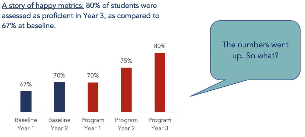 Say we get to the end of our literacy program, and our diligent program director reports back to her donors: 67% of students were proficient during the baseline year. 80% were proficient in year 3. A success for learning all round! Except our diligent program director finds that she struggles to convince people her program actually had an impact. Even though she did all she was asked—she reported on her metrics—her claims about impact will be undermined by persistent questions like How do you know the increase is because of your program? What would have happened without the afterschool program (would the numbers still have gone up?) Was there anything else, beyond the afterschool program, that caused the numbers to go up?
