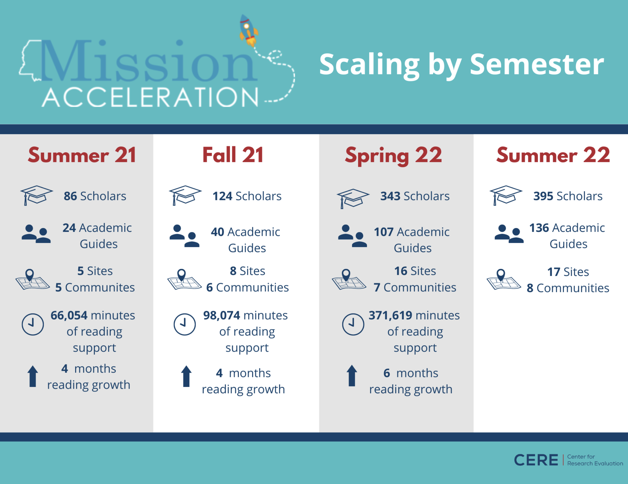 Working at CERE, I have the opportunity to serve as the external evaluator for projects that are making a difference for children and families in Mississippi. This is the sweet spot for me as an evaluator – work that is meaningful and connected to my expertise. One of those projects—Mission Acceleration— deserves a spotlight for the valuable work they have done over the past year to combat the impact of Covid learning loss. Led by a small program team and over 100 college students serving as tutors, they have assembled across the state to combat Covid related learning loss in reading.