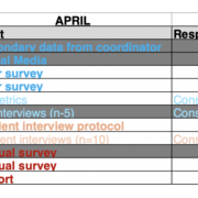 | How did you first start keeping your CERE projects organized? When Sarah Mason (Center Director) first arrived, we created a Word doc, which I call my Weekly Planning Sheet, that I update weekly and review with my supervisor when we meet. I color-code it as the week goes on to show what I’ve completed (green), what’s in progress (yellow), and what I need to remember for the future (gray). Most of our staff don’t use it anymore, but I find it extremely helpful. When I update it, I just copy and paste the current week’s information to a new page for the next week. I keep things that still require attention, add new things that need to be started, and remove things that are completed. A little later, Sarah started a new task-mapping process using flip charts. Each of us would take four pages (one for each month), and we’d use colored sticky notes for different tasks: protocol development, data collection, analysis, and deliverables. We would just handwrite each task and how many hours we thought they would take. Those notes would go up on that big sticky page, and then we would add up the total hours. If the total hours for a particular month were more than 120 then we would need to figure out what to do, such as moving some things to another month or hiring a consultant. I prefer to stay organized electronically, so I converted the sticky sheet idea to a spreadsheet where I keep track of tasks and time estimates four months in advance. Does the Center as a whole have an electronic system for tracking all the projects? We use a project-management software called Smartsheet. It includes all tasks for a project, broken down into sub-tasks and due dates. It also includes who is responsible for completing the task, provides a way to indicate progress so others can easily check on that, and can give notifications when things are coming due. It’s a good way to start a project by setting up the full timeline, and it updates in real-time, so anyone can have a complete picture at any time without needing to ask around. Do you have a regular time scheduled in your calendar to do all of this updating, and is it a lot of work? I have time blocked off at the beginning of every month to update my mapping, and each Friday I’ll update my Weekly Planning Sheet so it’s fresh for Monday. I usually operate by thinking about what’s a priority. What has to get done right away and what do I have time for in-between meetings? Say I have an hour and a half between meetings: I look at my Weekly Planning Sheet and determine where I can make the most progress during that time. If something is a high priority, I’ll give it a different color to show that it must get done immediately, regardless of how much time I have. This process doesn’t take me a lot of time because I’m just on it constantly. In a previous job, I had to keep track of my time in 15-minute increments and say how many hours I spent on each activity, so it’s just something that I’ve been trained to do. What motivates you to keep yourself so organized? I have a real fear of forgetting something and letting a client or my team down. I work on 7-10 projects at any given time, so it’s impossible to keep them all organized. I need these tools to help me remember what I need to do and when. Our team also collaborates on projects, so I want to make sure others can understand what I am working on and the progress I’ve made in case they need to take over or assist. Why is electronic organizing so important to you in your evaluation work? I think evaluators all know that we have to be organized, but it’s often hard for people to keep up with it and to know what’s helpful. I’ve made these digital color-coded organization tools my own, and that started back with the physical paper system that other staff still use and display in their offices. A lot of the staff here use paper calendars and take notes on paper but everything for me is electronic. I don’t like to handwrite anything. I type way faster—and visually, it helps me be super organized. I know exactly what I need to do and what project it is for. ____________________________________ Here’s an example of Shannon’s monthly mapping sheet. It’s color-coded to show which project it’s for and includes more specifics about the project: who’s responsible, the review date (if there is one), and an estimated number of hours. If somebody else is in charge of it, Shannon makes the color lighter so she’s aware of it but not focused on it. Some items are grayed out because they were completed or moved to the next month.